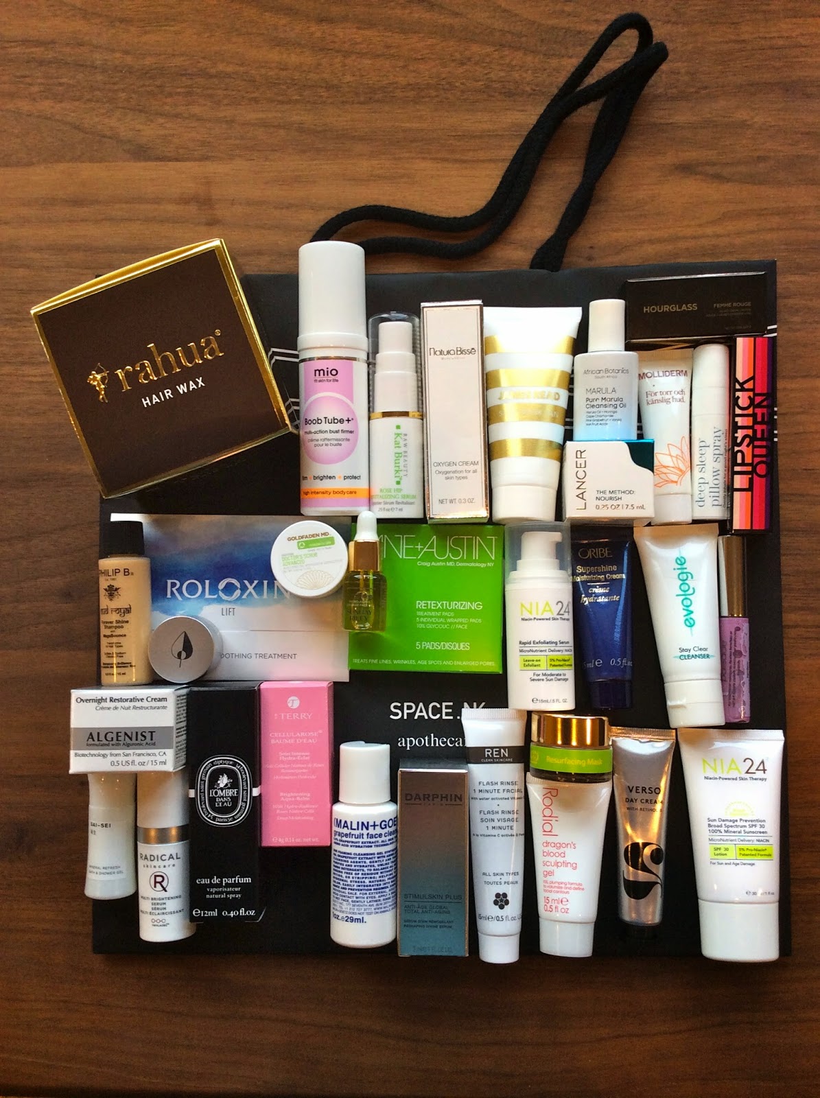 Excepting the full sized Rahua Hair Wax all the products were samples - although I hesitate to call them that as they are very generously sized samples. Skincare heavy I am overjoyed with this bag - it has so many things that I am looking forward to trying out - again, there's nothing that I won't use in here!